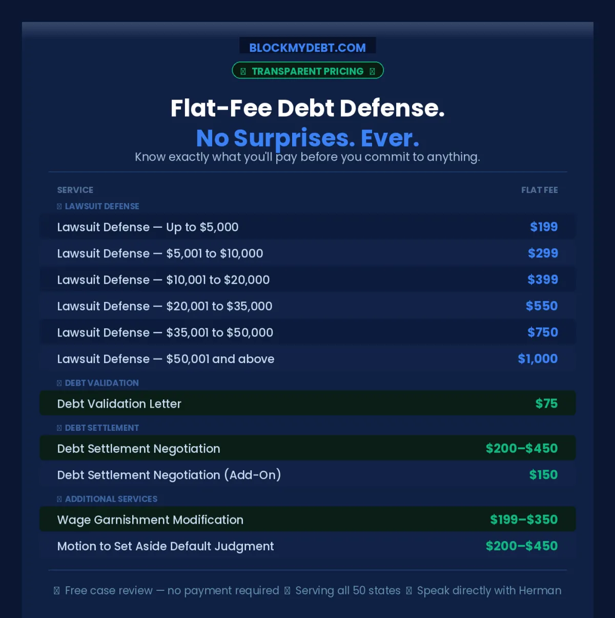 BlockMyDebt gives everyday people the tools, templates, and step-by-step guidance to fight back against debt collection lawsuits — without paying attorney hourly rates.