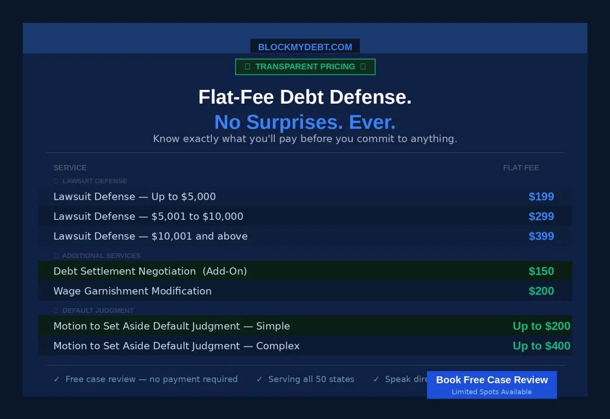 Serving clients in all 50 states | Flat-fee pricing — no surprises | 25+ years industry experience | Cases dismissed. Garnishments stopped. Judgments erased.